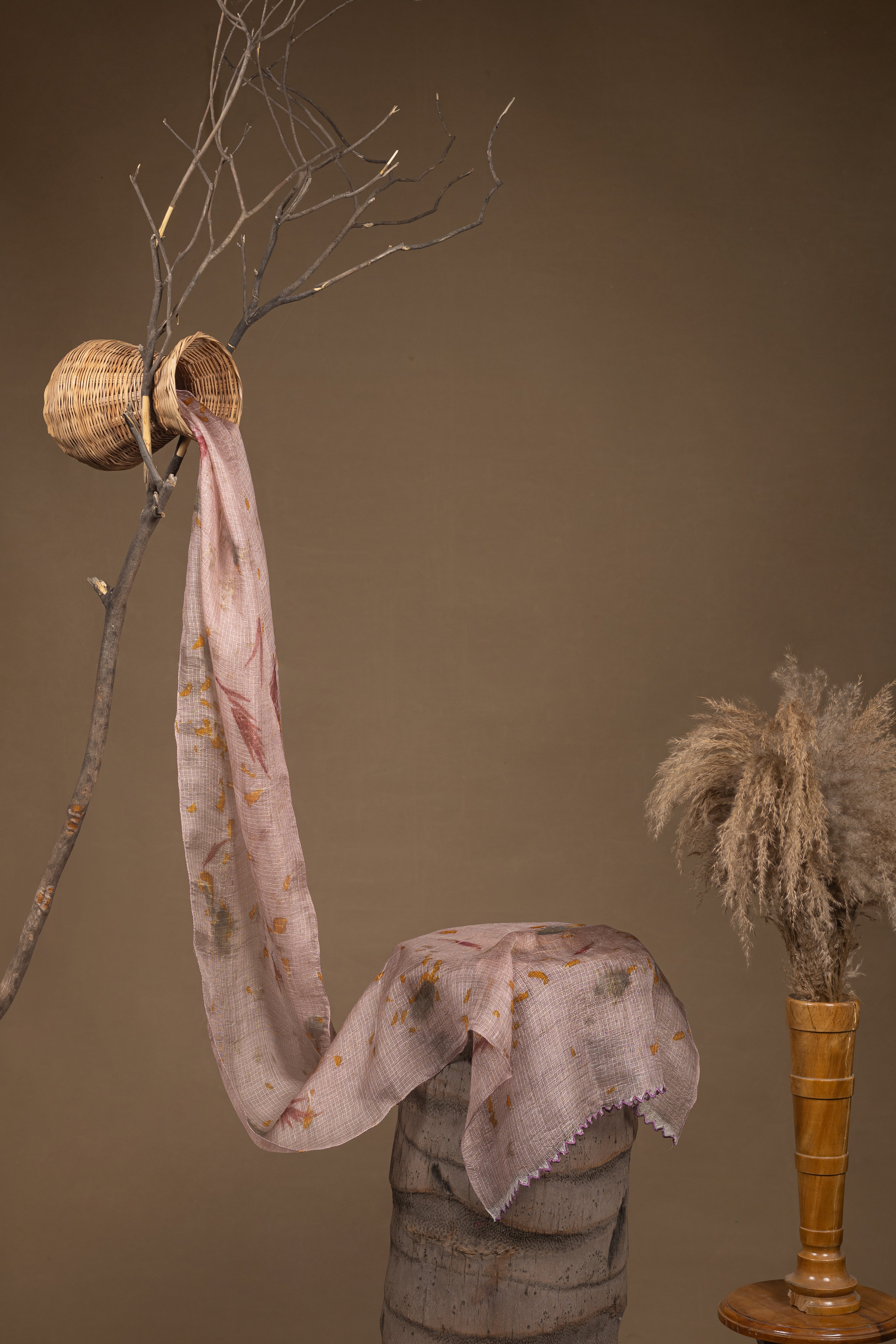 One-of-a-kind botanical stole. Crafted in handwoven Kota silk, this piece is naturally dyed and eco-printed with fresh leaves. The soft scallop detailing adds an elegant, timeless finish,...