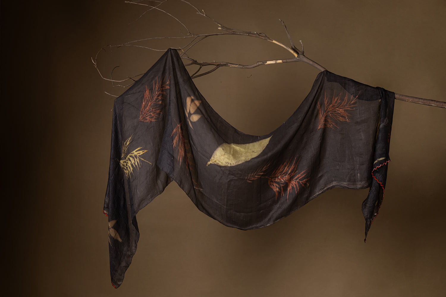 Soulful art where leaves and flowers leave their natural imprints on fabric through heat and pressure. Each piece captures the heartbeat of nature, making every print unique — a timeless story of the earth, told in color and pattern.