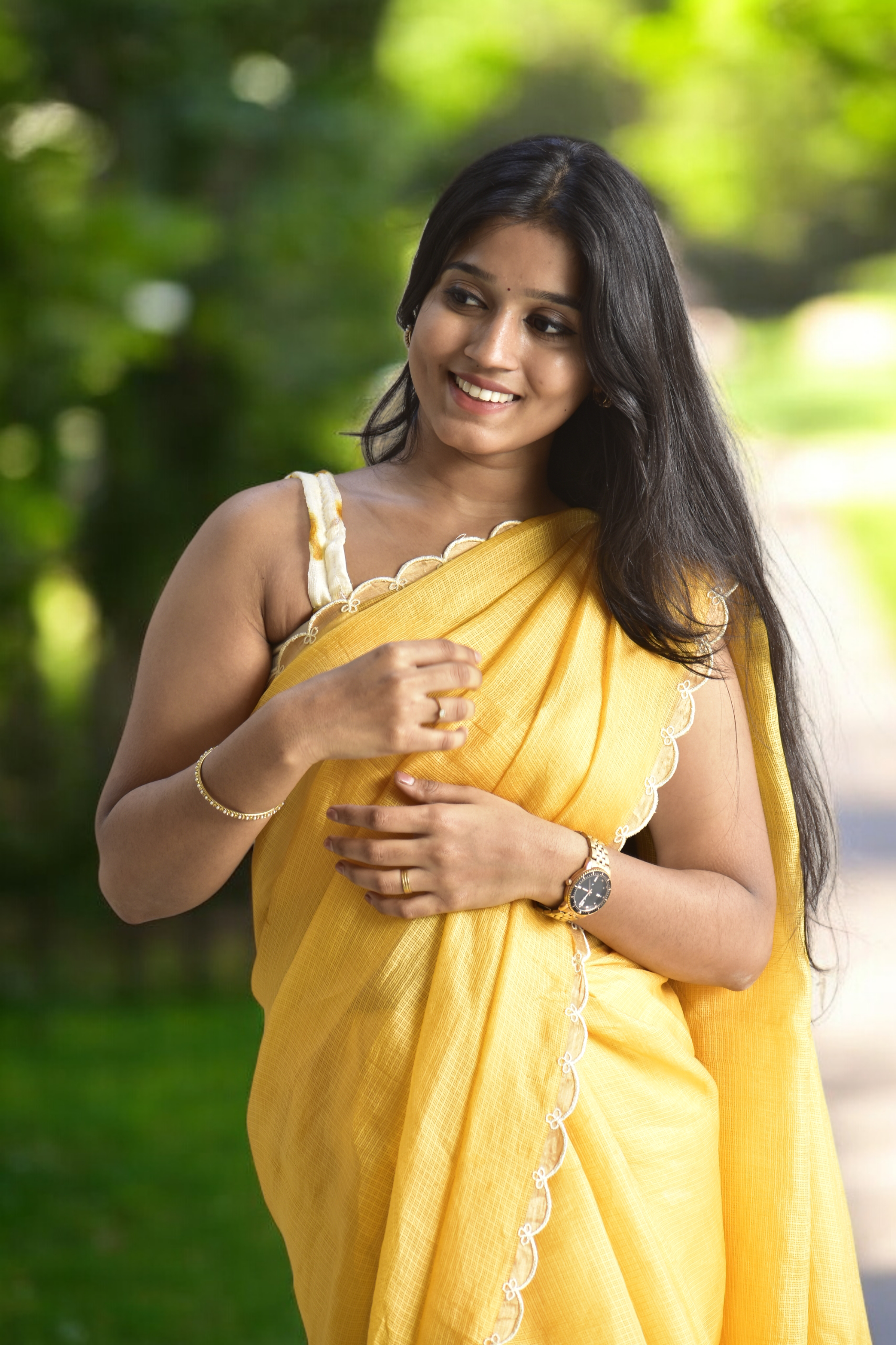 Ara is a thoughtfully handcrafted, naturally dyed saree, paired with a blouse piece ecoprinted using real flowers. Delicate scalloped edges on all four sides gracefully frame this timeless drape, celebrating mindful craftsmanship, slow fashion, and the beauty of organic imperfections.