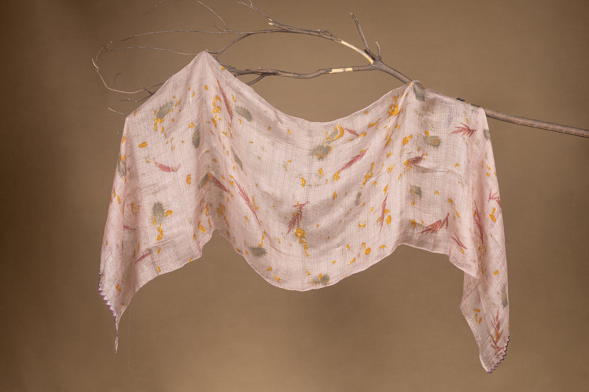 A one-of-a-kind botanical stole. Crafted in handwoven Habutai silk, this piece is naturally dyed using myrobalan and Spanish cherry flowers, then eco-printed with fresh leaves. The soft scallop detailing adds an elegant, timeless finish making it as unique as the hands and leaves behind its creation.