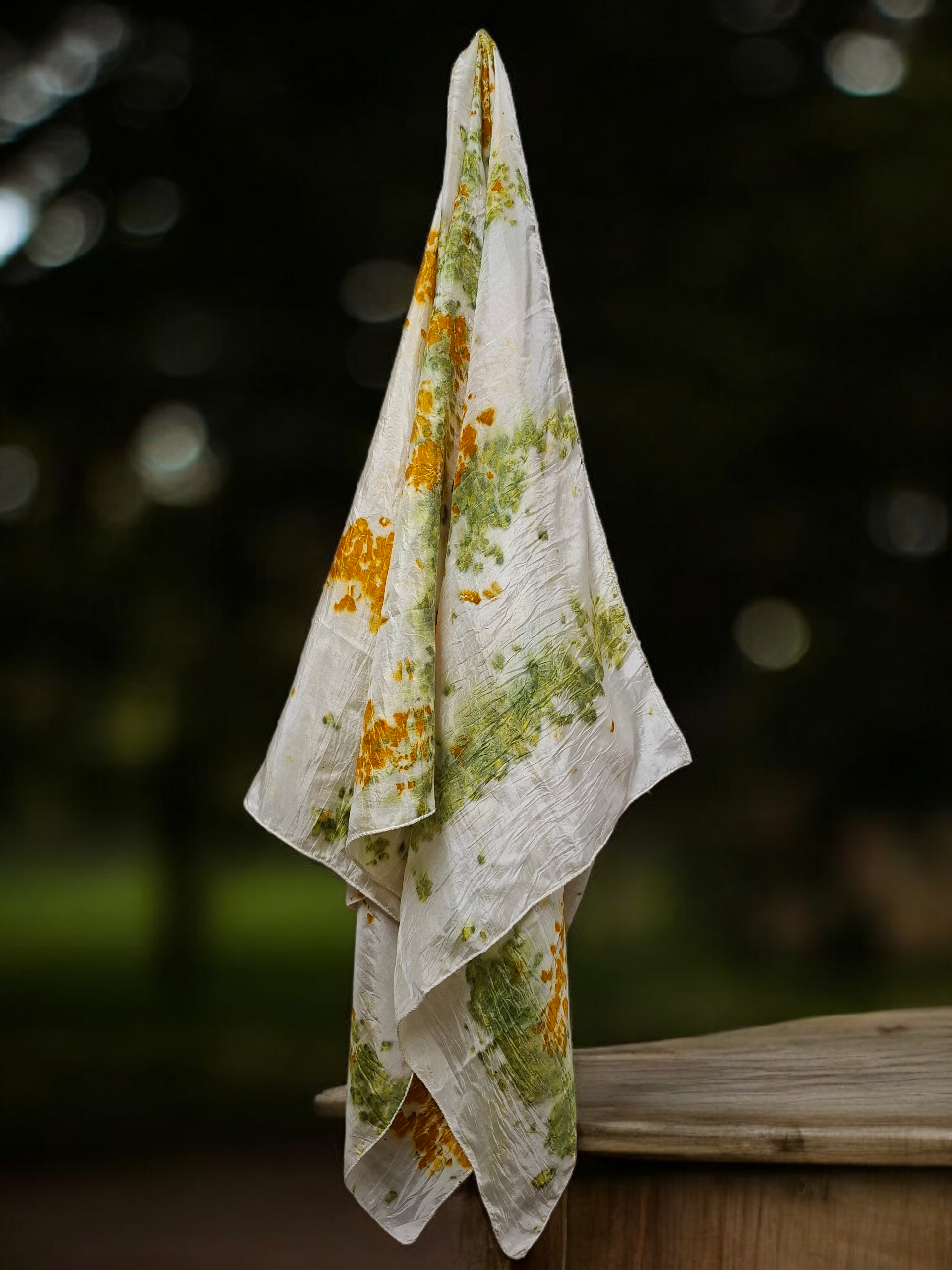 A one-of-a-kind botanical stole. Crafted in handwoven Habutai silk, this piece is eco-printed using fresh marigold and violet samandhi flowers. Each impression is shaped by hand and time, leaving behind the quiet, organic marks of its natural creation.