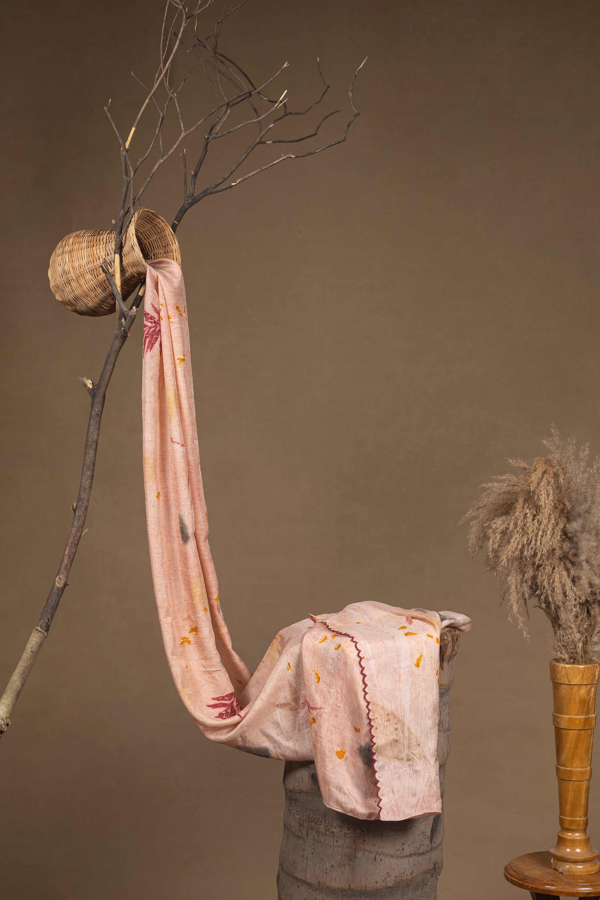 A one-of-a-kind botanical stole. Crafted in handwoven Habutai silk, this piece is naturally dyed using myrobalan and Spanish cherry flowers, then eco-printed with fresh leaves. The soft scallop detailing adds an elegant, timeless finish making it as unique as the hands and leaves behind its creation.